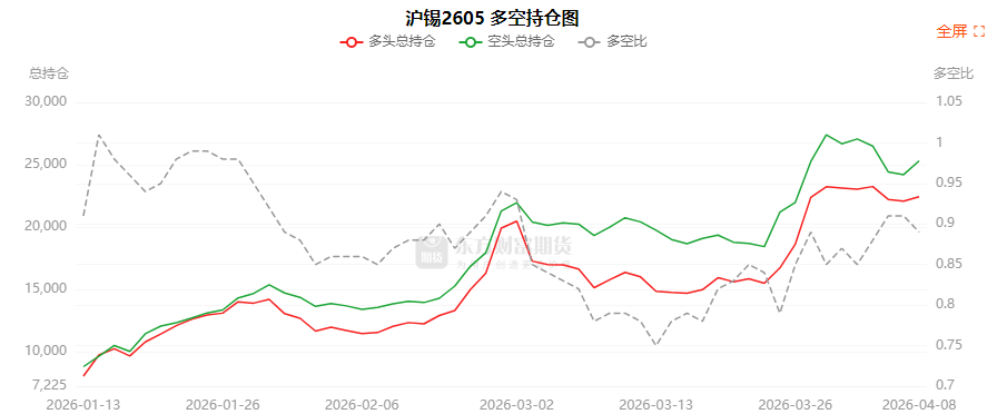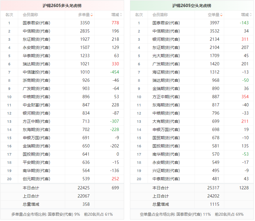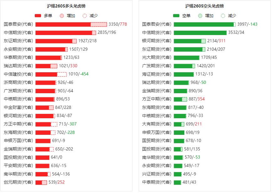 总体而言,沪锡2605合约今日增仓上行,多空持仓排名前20席中,多空双方均呈进场态势,多头进场意愿弱于空头。
