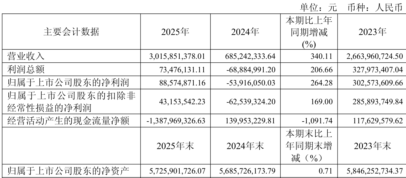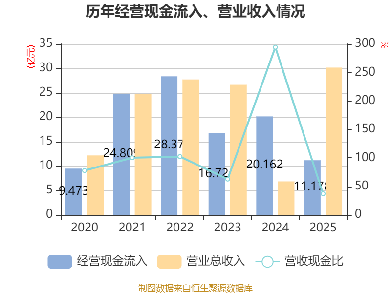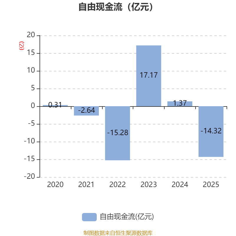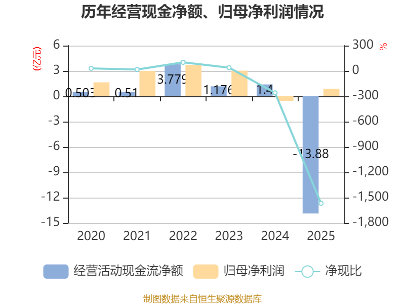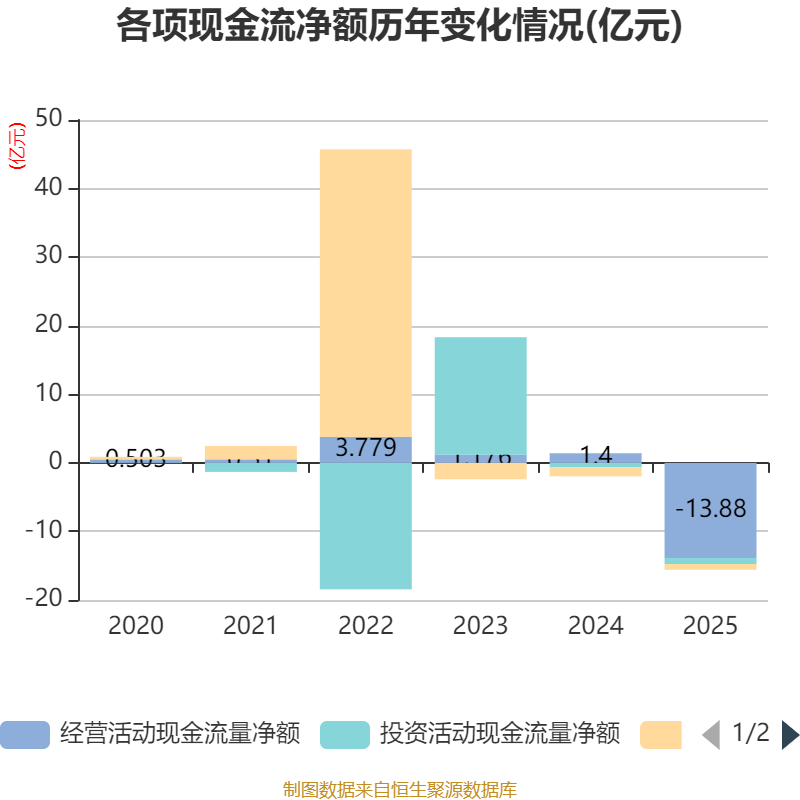 截至2025年,公司经营活动现金流净额为-13.88亿元,同比减少15.28亿元;筹资活动现金流净额-8292.1万元,同比增加5062.37万元;投资活动现金流净额-8858.02万元,上年同期为-6398.13万元。