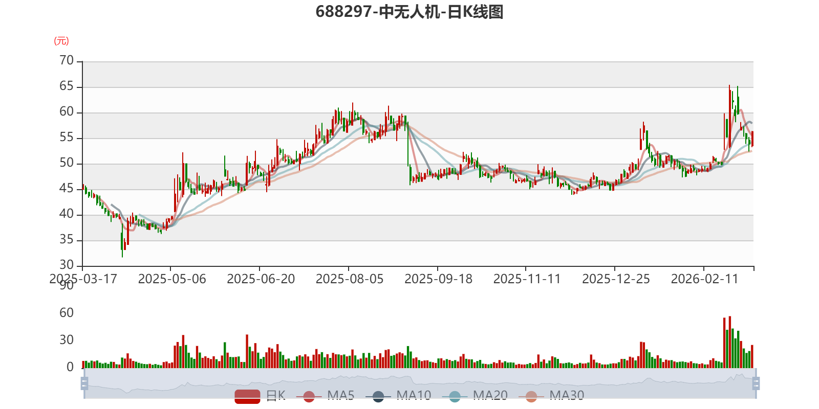 中证智能财讯中无人机(688297)3月17日披露2025年年度报告。2025年,公司实现营业总收入30.16亿元,同比增长340.11%;归母净利润8857.49万元,同比扭亏;扣非净利润4315.35万元,同比扭亏;经营活动产生的现金流量净额为-13.88亿元,上年同期为1.4亿元;报告期内,中无人机基本每股收益为0.13元,加权平均净资产收益率为1.55%。公司2025年度分配预案为:拟向全体股东每10股派现2元(含税)。