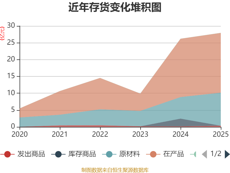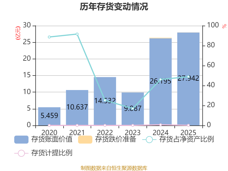 从存货变动来看,截至2025年末,公司存货账面价值为27.94亿元,占净资产的48.8%,较上年末增加1.75亿元。其中,存货跌价准备为320.87万元,计提比例为0.11%。