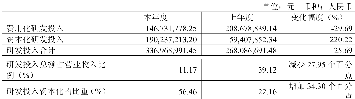 2025年全年,公司研发投入金额为3.37亿元,同比增长25.69%;研发投入占营业收入比例为11.17%,相比上年同期下降27.95个百分点。此外,公司全年研发投入资本化率为56.46%。