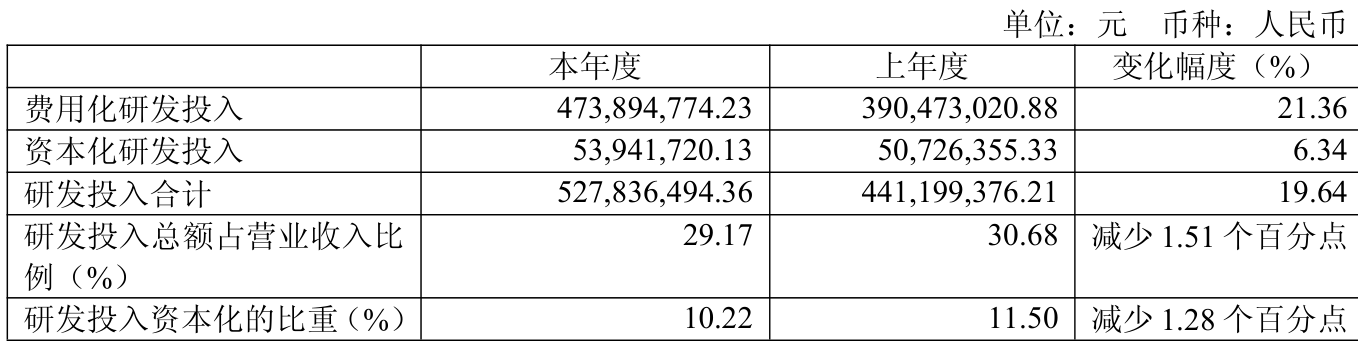 2025年全年,公司研发投入金额为5.28亿元,同比增长19.64%;研发投入占营业收入比例为29.17%,相比上年同期下降1.51个百分点。此外,公司全年研发投入资本化率为10.22%。