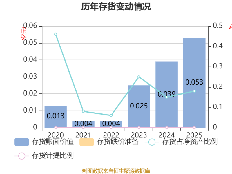 从存货变动来看,截至2025年末,公司存货账面价值为531.46万元,占净资产的0.18%,较上年末增加140.91万元。公司本期没有计提存货跌价准备。