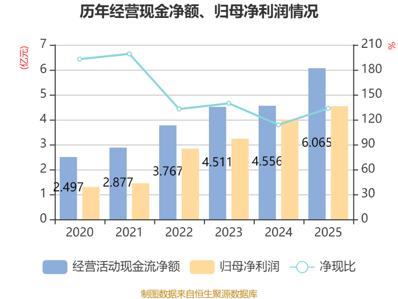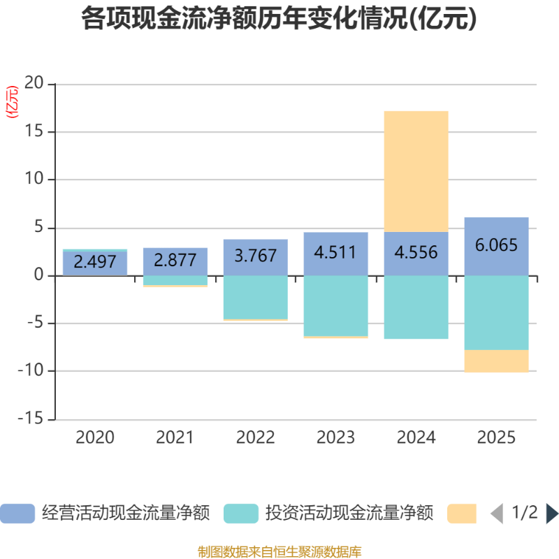 截至2025年,公司经营活动现金流净额为6.06亿元,同比增长33.1%;筹资活动现金流净额-2.35亿元,同比减少14.95亿元;投资活动现金流净额-7.76亿元,上年同期为-6.62亿元。