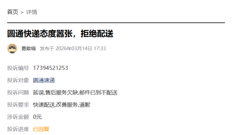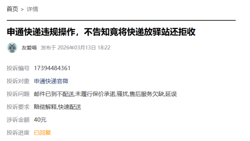 如3月13日,云南丽江的一位民宿老板也遭遇了申通快递的“霸王操作”——在未按要求投递后,快递员强制将快递拒收退回,只留下一句“自己找商家申请退款”。