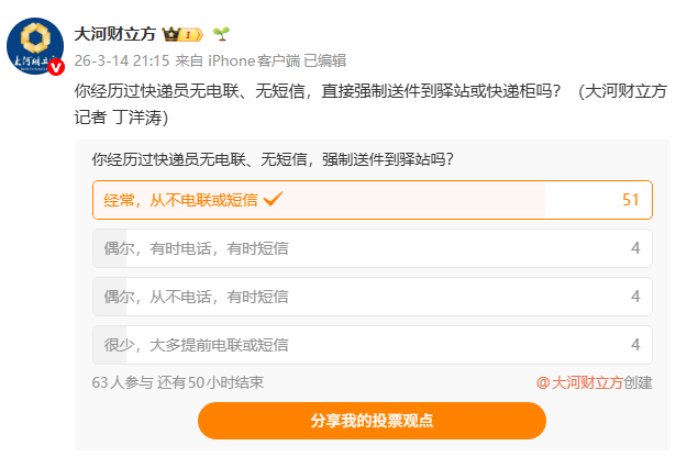 在今年3·15前夕,大河财立方在微博平台发起了一项关于快递配送习惯的调查。截至发稿,参与投票选择“从不电联或短信”的用户,占比高达80.9% 。这一数据,直观地反映了快递“不告而投”现象的普遍性,以及消费者对此积压已久的不满。